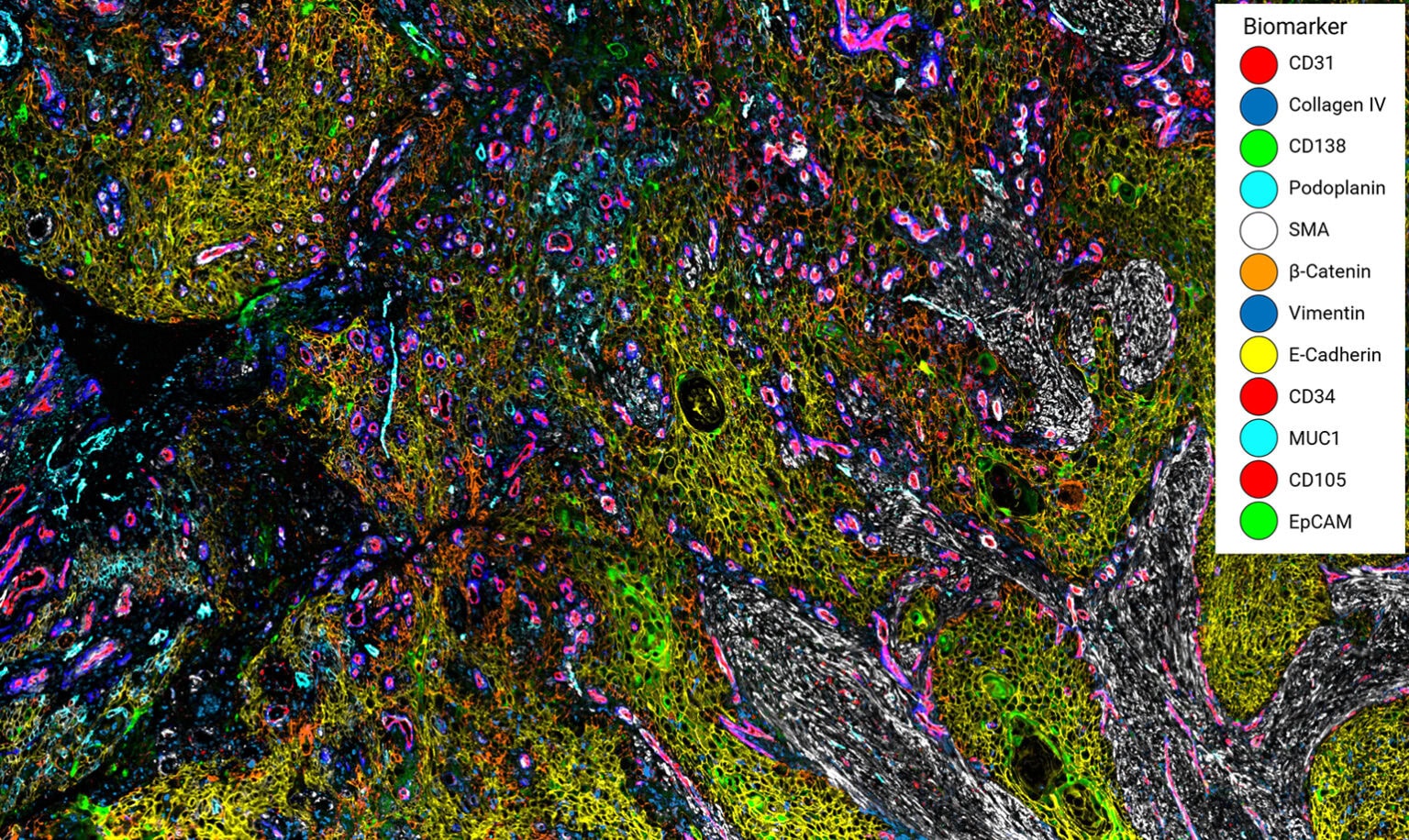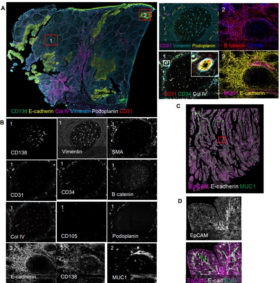 Providing a modular building block for essential spatial discovery of key structural features of human FFPE samples, the Tissue Architecture Assay Kit includes a panel of antibodies curated and optimized by our robust validation workflow. The panel targets key epithelial, lymphatic, lamina, vasculature and connective tissue biomarkers and can be expanded by pairing with additional VistaPlex Multiplexing Assay Kits or your own markers of choice.